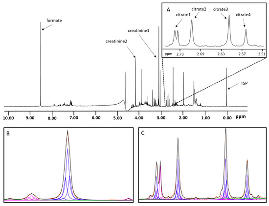 Representative 1D 1H NMR spectrum for urine using a pulse-acquire experiment with WET solvent suppression. Resonance assignment for relevant signals are shown. (A): spectral expansion showing the four citrate signals. (B): Overlay of creatinine observed signal (red) and the mathematical model (black), along with analyte Lorentzian (blue), non-analyte Lorentzian (magenta) and linear baseline (green) components. (C): The citrate observed signals (red) are overlaid with the mathematical fit (black). The analyte Lorentzian lineshapes (blue), non-analyte Lorentzian lineshapes (magenta) and linear baseline (green) are also shown.