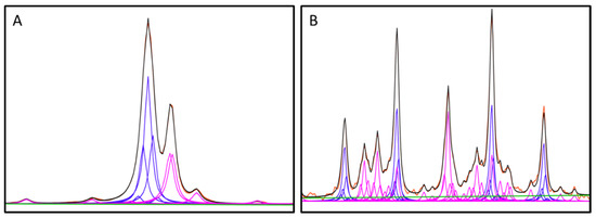Overlays of observed NMR signal (red) and the mathematical model (black), along with analyte Lorentzian (blue), non-analyte Lorentzian (magenta) and linear baseline (green) components resulting from deconvolution of creatinine and citrate regions. (A): Creatinine region with nearby or overlapping signals. (B): Citrate region with nearby or overlapping signals.