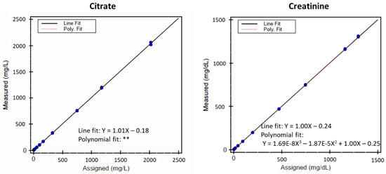 Linearity of NMR-measured versus assigned values of citrate (left) and creatinine (right) in the urine citrate and creatinine assay. ** After regression, no 2nd/3rd order polynomial fit was statistically better than the linear fit at the 5% significance level. Thus, only the linear fit is shown.