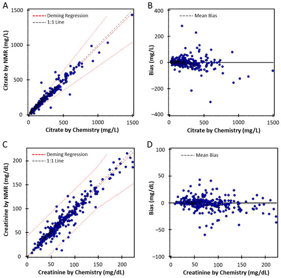 Deming regression comparison between chemistry and NMR measured citrate (A) and creatinine (C). Bland–Altman plots of the residuals for citrate (B) and creatinine (D). The limits of agreement (LOAs) are depicted as dotted blue lines and 0% bias is a solid grey line.