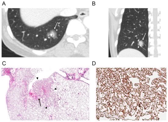 - Isaka, T.; Yokose, T.; Ito, H.; Washimi, K.; Imamura, N.; Watanabe, M.; Imai, K.; Nishii, T.; Yamada, K.; Nakayama, H.; et al. Case of solitary pulmonary capillary hemangioma: Pathological features based on frozen section analysis. Pathol. Int. 2013, 63, 615–618. [Google Scholar] [CrossRef]