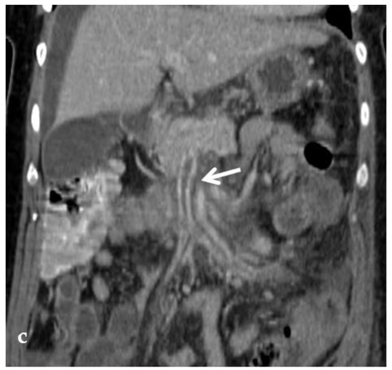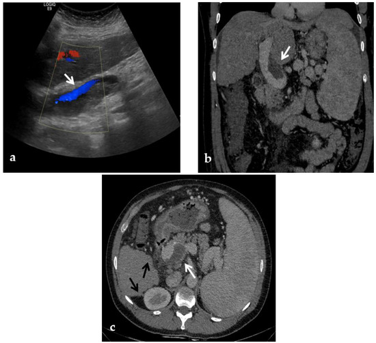 Color-Doppler Ultrasound and CT images of portal vein thrombosis in a 54-year-old male suffering from liver cirrhosis. (a) Color-Doppler Ultrasound image shows a narrow hepatopetal flow (arrow) despite a large endoluminal thrombus in the extrahepatic portal trunk. (b) Portal phase coronal CT image shows the lack of luminal enhancement and increased portal vein caliber due to a large endoluminal thrombus in the extrahepatic trunk (arrow). (c) Portal phase axial CT image shows the extension of the portal vein thrombosis up to the splenomesenteric confluence (white arrow); liver cirrhosis is visible on the the liver surface that presents lobulated margins (black arrows).