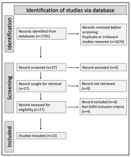 We initially identified 1701 studies. A total of 1674 were excluded after the first screening because they were either duplicates or irrelevant. Following a full-text revision of the remaining 27 articles, four were further excluded because they did not have a healthy control group. Thus, 23 studies were included in the final analysis (Figure 1) [28,29,30,31,32,33,34,35,36,37,38,39,40,41,42,43,44,45,46,47,48,49,50]. There was no disagreement between the two independent investigators. In all studies, patients with RA had no history of other conditions potentially associated with alterations in MPV, PDW, or RDW values. Data on DAS28 were reported in only three studies [32,34,35]. The characteristics of the retrieved studies, published between 2008 and 2022, are presented in Table 1.