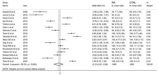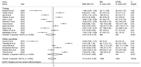 In subgroup analysis, no significant differences (p = 0.84) were observed in SMD between retrospective (SMD = 0.99, 95% CI 0.67 to 1.31, p < 0.001; I2 = 87.0%, p < 0.001) and prospective studies (SMD = 0.95, 95% CI 0.80 to 1.10, p < 0.001; I2 = 0.0%, p = 0.856; Figure 15). However, heterogeneity was virtually abolished in prospective studies. No significant differences in SMD (p = 0.633) were also observed between studies conducted in Turkey (SMD = 1.02, 95% CI 0.69 to 1.36, p < 0.001; I2 = 75.0%, p = 0.007) and other countries (SMD = 0.89, 95% CI 0.52 to 1.27, p < 0.001; I2 = 86.2%, p < 0.001, Figure 16). In univariate meta-regression, no significant associations were observed between the effect size and age (t = −0.564, p = 0.59), proportion of males (t = −1.03, p = 0.33), publication year (t = −1.11, p = 0.30), or sample size (t = −1.37, p = 0.21). Associations between effect size and CRP or ESR could not be performed due to the small number of studies reporting these parameters.