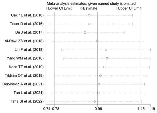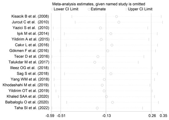 The forest plot for MPV values in RA patients and control subjects is reported in Figure 2. Given the substantial between-study heterogeneity observed (I2 = 95.3%, p < 0.001), random-effects models were used. Pooled results showed that the MPV values were not significantly different between RA patients and healthy controls (SMD = −0.13, 95% CI −0.51 to 0.26, p = 0.515). In sensitivity analysis, the corresponding pooled SMD values were not substantially altered when each study was sequentially omitted (effect size range, between −0.22 and −0.02; Figure 3).