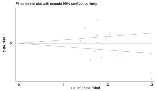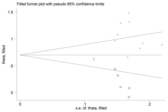 There was no significant publication bias (Begg’s test, p = 0.44; Egger’s test, p = 0.12). The “trim-and-fill” method identified five missing studies to be added to the left side of the funnel plot to ensure symmetry (Figure 14). However, the resulting effect size remained significantly different (SMD = 0.72, 95% CI 0.50 to 0.93, p < 0.001).