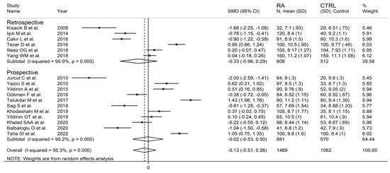 Forest plot of studies examining the mean platelet volume in patients with rheumatoid arthritis and healthy controls according to study design.
