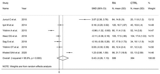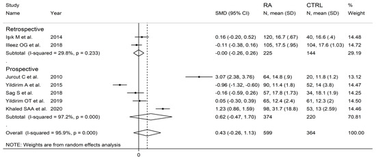 Seven studies with in 599 RA patients (mean age 52 years, 74% females) and 364 healthy controls (mean age 50 years, 68% females) investigated the PDW [29,31,32,39,41,45,46]. Five studies were conducted in Turkey [31,32,39,41,45], one in Romania [29], and one in Egypt [46]. Five studies were prospective [29,32,41,45,46], and the remaining two retrospective (Table 1) [31,39].
