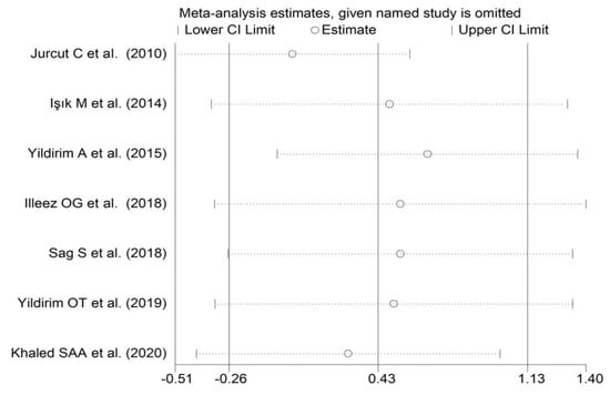 Sensitivity analysis of the association between the mean platelet volume and rheumatoid arthritis. For each study, the displayed effect size (hollow circles) corresponds to an overall effect size computed from a meta-analysis excluding that study.