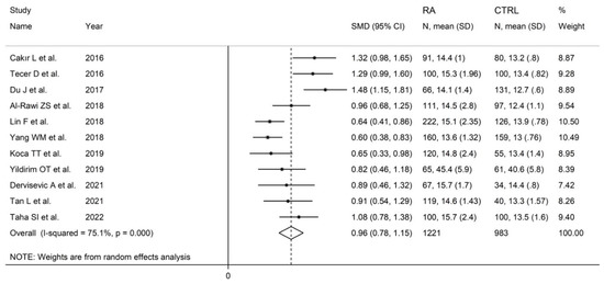 Eleven studies in 1221 RA patients (mean age 55 years, 80% females) and 983 healthy controls (mean age 53 years, 73% females) reported data on RDW [33,35,36,38,40,42,44,45,48,49,50]. Four studies were conducted in Turkey [33,35,44,45], four in China [36,40,42,49], and one in Egypt [50], Iraq [38], and Bosnia and Erzegovina [48], respectively. Six studies were retrospective [33,35,36,40,42,44], and the remaining five were prospective (Table 1) [38,45,48,49,50].