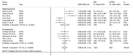 Forest plot of studies examining the red cell distribution width in patients with rheumatoid arthritis and healthy controls according to study design.