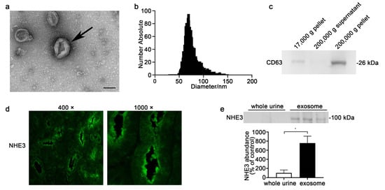 We extracted exosomes by ultracentrifugation. The 200,000 g pellets were characterized using a transmission electron microscope, a nano-tracking analyzer, and Western blotting. The electron microscopy showed that the pellets were round and cup-shaped, with a diameter of less than 100 nm (Figure 1a). The nano-tracking analyzer revealed that the diameter of the particles was 50–100 nm, with an average of 75 nm (Figure 1b). Western blotting showed that the CD63 protein, a marker of exosomes, had the highest expression in the 200,000 g precipitate and a small amount in the 17,000 g precipitate, but almost no expression in the 200,000 g supernatant (Figure 1c). The immunofluorescent staining for NHE3 (apical membrane) reflected NHE3’s location in the kidney, mainly at proximal tubules (Figure 1d). Next, we compared the NHE3 levels in the whole urine and urinary exosomes. The NHE3 protein abundance in the exosomes was six times higher than that in the whole urine (755.6 ± 152.6 vs. 100 ± 63.5, p < 0.05) (Figure 1e).