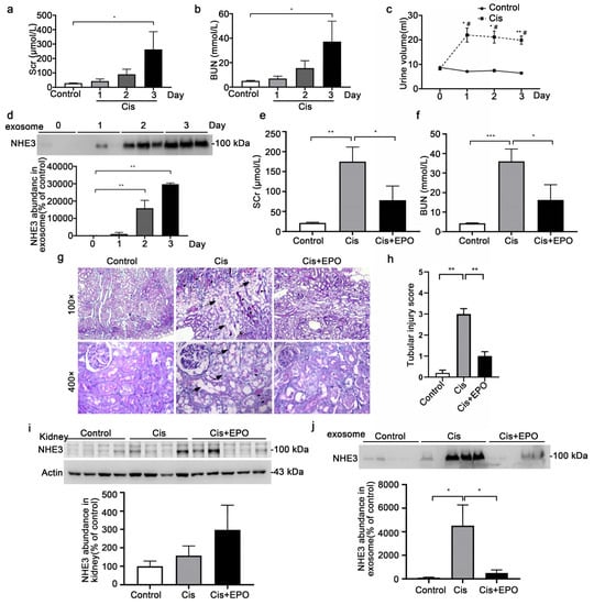 The Scr (379.7 ± 32.9 vs. 28.7 ± 1.8 μmol/L, p < 0.01) and BUN (53.9 ± 1.9 vs. 5.0 ± 0.4 mmol/L, p < 0.01) were markedly increased at day 3 after cisplatin injection (Figure 2a,b). The 24 h urine output was much higher in the cisplatin group, whether compared with the control or the output in the cisplatin group at day 0, which was consistent with a previous study [21] (Figure 2c). The urinary exosomal NHE3 increased on day 2 (15, 880 ± 2866 vs. 100 ± 44.3, p < 0.01), 1 day before Scr increased, and continued to increase on day 3 (29,688 ± 475 vs. 100 ± 44.3, p < 0.01). Next, we constructed an AKI recovery model by pretreatment with EPO 15 min before cisplatin injection and 2 days after cisplatin injection. After EPO pretreatment, the increases in Scr and BUN were reversed (78.2 ± 35.4 vs. 175 ± 36.3 μmol/L, p < 0.05) (16.2 ± 7.8 vs. 35.9 ± 6.3, p < 0.05), respectively (Figure 2e,f). Histology showed that the tubule dilation, loss of brush border and cast formation were ameliorated (Figure 2g). The tubular injury score was significantly increased in the cisplatin group and improved after EPO pretreatment (Figure 2h). There was no difference in the NHE3 protein abundance in the kidney among the three groups (Figure 2i). The urinary exosomal NHE3 was increased in the cisplatin group (4517 ± 1758 vs. 100 ± 41.63, p < 0.05) and decreased after EPO pretreatment (501.2 ± 253.1 vs. 4517 ± 1758, p < 0.05), reaching the level of the control group (Figure 2j).