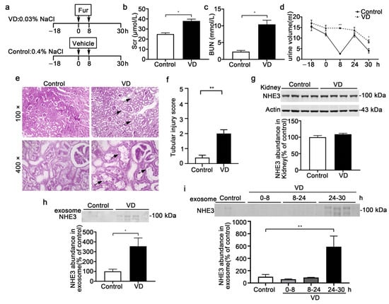A low-NaCl intake and furosemide injection is recognized as a volume-depletion (VD) [17] AKI model (Figure 3a). The increases in Scr (38 ± 1.8 vs. 25 ± 1.2 μmol/L, p < 0.05) and BUN (10.4 ± 1.2 vs. 2.3 ± 0.4 mmol/L, p < 0.05) mean that the VD-AKI model was successfully established (Figure 3b,c). The elevation of urine output after furosemide treatment was in accordance with volume depletion (Figure 3d). The pathological injury in VD-AKI included glomerular capillary loop shrinkage and tubule dilation (Figure 3e). The tubular injury score was higher in the VD group (Figure 3f). We detected the abundance of the NHE3 protein in the kidney, there was no change between the control and VD groups (Figure 3g). Otherwise, the exosomal NHE3 in all the 30 h urine samples was increased in the VD group (589.3 ± 173 vs. 100.3 ± 36.8, p < 0.05) (Figure 3h). To detect whether it could serve as an early biomarker, we split all the urine into different periods: 0–8 h, 8–24 h and 24–30 h urine. The urinary exosomal NHE3 was increased at the end time of 24–30 h (355.5 ± 83.9 vs. 100 ± 22.6, p < 0.01) compared with the control. However, it did not change at either 0–8 h or 8–24 h compared with the control (Figure 3i).