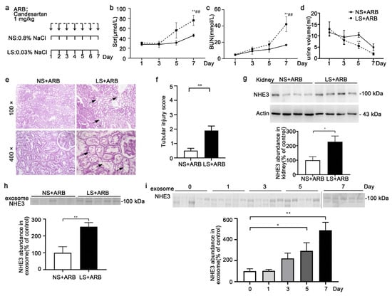 A low-salt intake with the administration of candesartan can induce AKI, whether in normotensive, hypertensive, or nephritic rats, as reported in our other article (under review). The SD rats were fed a 0.03% NaCl or 0.8% NaCl diet and intraperitoneally injected with candesartan, an angiotensin receptor blocker (ARB), for 7 days (Figure 4a). Both the Scr (76 ± 10.3 vs. 45.7 ± 2.7 μmol/L, p < 0.05) and BUN (42.2 ± 9.1 vs. 16.7 ± 0.9, p < 0.05) increased gradually, with a statistically significant difference on day 7 between the two groups (Figure 4b,c). The urine output decreased gradually in both groups (Figure 4d). Histological analysis of renal tissue showed tubule dilation and foam cells gathering, indicating tubular injury (Figure 4e,f). The NHE3 protein in the kidney tissue (228.1 ± 39.3 vs. 100 ± 24.2, p < 0.05) was increased in the LS + ARB group compared with the NS + ARB group (Figure 4g). The urinary exosomal NHE3 protein (254.8 ± 24.5 vs. 100± 36.1, p < 0.01) was markedly increased, and the trend was similar to that in the kidney tissue (Figure 4g, h). We present the time course of urinary exosomal NHE3 expression on days 0, 1, 3, 5, and 7 in LS + ARB-induced AKI rats. It gradually increased, with a statistically significant difference on day 5 (293 ± 7.2 vs. 100 ± 22.8, p < 0.05), which was 2 days earlier than the Scr increase, and it was still elevated at day 7 (702.8 ± 108.1 vs. 100 ± 22.8, p < 0.01) (Figure 4i).