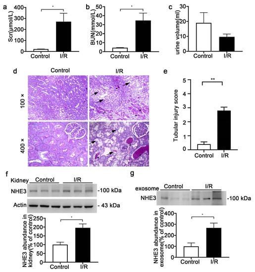 The rats were bilaterally clamped for 40 min and reperfused for 24 h. The Scr (270.8 ± 76.5 vs. 22 ± 1.0 μmol/L, p < 0.05) and BUN (34.7 ± 8.2 vs. 4.3 ± 0.2 mmol/L, p < 0.05) were prominently elevated (Figure 5a,b). The urine volume showed a slight decline but showed no statistically significant difference (Figure 5c). The kidney histomorphology showed tubular dilation, brush border loss and cast formation in the I/R group, and the tubular injury score was higher (Figure 5d,e). Both the kidney NHE3 (195.2 ± 22.6 vs. 100 ± 14.1, p < 0.05) and urinary exosomal NHE3 (267 ± 44.4 vs. 100 ± 31.1, p < 0.05) were raised in the I/R rats compared with the control rats (Figure 5f,g).