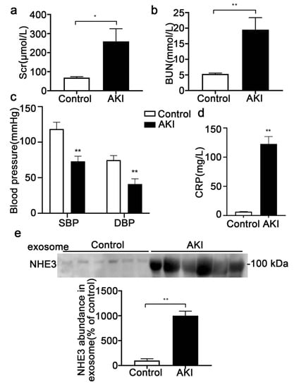 Six sepsis-associated AKI patients and six healthy volunteers were enrolled. Among the six AKI patients, four were diagnosed with pneumonia, one with cholecystitis, and one with gastroenteritis. There were no urinary tract infections. Two patients were administered levofloxacin, two cefoperazone sulbactam, one piperacillin tazobactam and two ornidazole. None had urinary tract infections. None received aminoglycosides, iodinated contrast media, or any diuretics that may have damaged renal tubules and affected the expression of NHE3. The age (55 ± 7.2 vs. 58 ± 6.5, p > 0.05) and gender (male%, 50% vs. 50%, p > 0.05) had no differences between the AKI and control groups. The Scr (258.5 ± 66.9 vs. 68.7 ± 5.4 umol/L, p < 0.05) (Figure 6a) and BUN (19.5 ± 3.9 vs. 5.3 ± 0.3 mmol/L, p < 0.01) were significantly elevated (Figure 6b). The systolic blood pressure (73 ± 2.9 vs. 118.5 ± 3.9 mmHg, p < 0.01) and diastolic blood pressure (41 ± 3.1 vs. 74.8 ± 2.6 mmHg, p < 0.01) of the AKI patients were both lower (Figure 6c), and the serum C reactive protein (CRP), a marker of infection, was markedly increased (122.7 ± 12.6 vs. 6.6 ± 0.6 mg/L, p < 0.01) compared to those in the healthy volunteers (Figure 6d), indicating that septic shock occurred. The NHE3 in urinary exosomes (1003 ± 89.7 vs. 100 ± 36, p < 0.01) was also significantly increased compared with that in the healthy control group (Figure 6e).