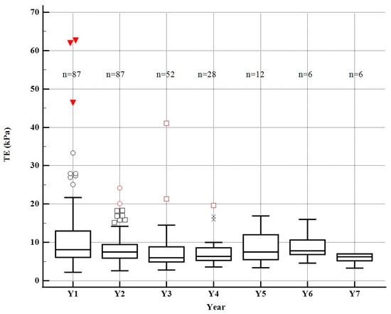 - 6 patients (6.9%) had at least six LSM made during the follow-up, with significant differences between the six LSM, 17.0 ± 9.2 kPa vs. 9.5 ± 5.1 kPa vs. 8.5 ± 3.8 kPa vs. 9.3 ± 5.2 kPa vs. 8.8 ± 4.8 kPa vs. 8.6 ± 4.5 kPa, p = 0.01, but post hoc tests showed that after the second year the decrease was not significant (second-year LSM vs. third-year LSM, p = 0.70; third-year LSM vs. fourth-year LSM, p = 0.76; fourth-year LSM vs. fifth-year LSM, p = 86; fifth-year LSM vs. sixth-year LSM, p = 0.94).
