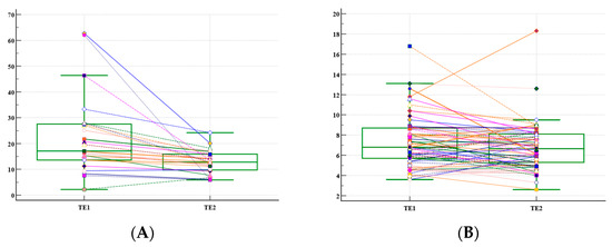 - 87 patients had at least two LSM made during the follow-up, and there was a significant decrease in the mean liver stiffness values from the first measurement vs. the second, 11.7 ± 8.4 kPa vs. 8.5 ± 4.1 kPa, p = 0.001 (Figure 1).