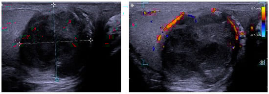 Scrotum ultrasound showing a 28 × 29 mm2 heterogeneous, hypoechoic, and solid mass with decreased blood flow, but surrounded with increased blood flow.