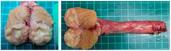 Specimen showing a 3.0 × 2.5 × 2.0 cm3 necrotic tumor with pus content in the testes, which had invaded through the tunica albuginea to the tunica vaginalis grossly.
