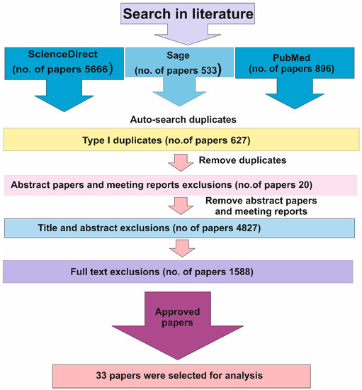 There were only few methods of actively determining and monitoring. However, that may have been defined at that specific point in time, dating back as far as year 1983 [22]. After excluding title, abstract and full text, where studies unrelated to our research question were withdrawn from the review process, 33 papers were left for examination. The search strategy is based on Reference [23] and summarized in Figure 1.