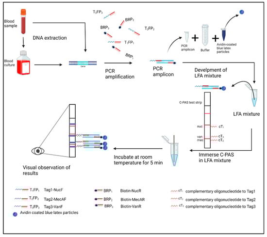 Figure 1. Schematic diagram of the of the multiplex polymerase chain reaction (PCR)-based DNA lateral flow assay (MBDLFA) workflow; created with biorender.com. The designed chromatography-printed array strip (C-PAS) containing complementary oligonucleotides to each single-stranded tag and indicating the expected positions of the generated colored line specific to each tag is shown. The red lines in strip represent position markers that help localization of test lines. Tag1-NucF, Tag2-MecAF, Tag3-VanF: single-stranded oligonucleotides-tagged forward primers for amplification of nuc, mecA, and van genes, respectively; Biotin-NucR, Biotin-MecAR, Biotin-VanR: biotin-labelled reverse primers for amplification of nuc, mecA, and van genes, respectively.