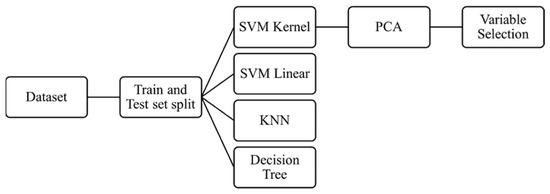 Multiple machine learning classifier algorithms such as k-nearest neighbor (KNN), support vector machine (SVM) linear, SVM kernel RBF, and decision tree (DT) were used on the dataset as recently described in literature [24,25]. The hyperparameters were considered as the default value used by SVC (support vector classifier) which fits the model and returns the “best fit” hyperplane for the data. To estimate the algorithms, training and testing methodology were used and ultimately the performance evaluation was calculated utilizing the accuracy and confusion matrix. A summary of the workflow is presented in Figure 1.