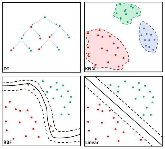 Simplified illustration of the classifier algorithm function for the decision tree (DT), k-nearest neighbor (KNN), support vector machine (SVM), radial basis function (RBF) kernel and SVM linear are portrayed. DT is characterized by the nodes (dots) representing variables and the branches (arrows) representing decisions. KNN calculates data proximity (Euclidian distance) by assuming similar variables remain at a shorter distance from one another. RBF computes similarity between two data points ranging from 0 (similar) to 1 (dissimilar) enabling complex separation between data points. SVM linear separates the data points based on the linear dividing “hyperplane”, albeit with less flexibility than SVM RBF kernel. Different colored dots represent different cohorts; solid line corresponds to best separation of cohorts; dashed lines represent confidence intervals.
