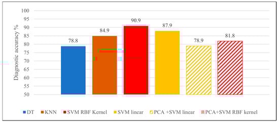 The choice of classifier algorithm is constantly challenged, as performance is dependent on the complexity and distribution of the dataset. Our results showed that diagnostic accuracy varies depending on the classifier used. In this case, utilizing the SVM linear is simpler and more efficient than RBF, although it results in lowered diagnostic performance as data is not always linearly separable. Although RBF shares advantages with KNN, it often remains superior by overcoming the space complex problem. The power of the RBF kernel lies in its ability to map points in higher-dimensional spaces, which appears best suited for our dataset.