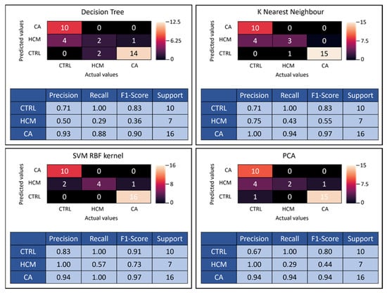SVM RBF kernel presented the highest accuracy rate among all employed methods, which is why it was the algorithm of choice for PCA. Corresponding confusion matrices and classification reports were generated for all four classifier algorithms (Figure 4). Confusion matrices demonstrate the performance summary of the classifier between the actual and the predicted outcomes utilizing 20% of the data. For example, the confusion matrix for SVM RBF kernel is displayed (Figure 4), whereby out of 17 biopsy-validated CA patients, 1 was predicted false negative, reducing the precision (positive predictive value) to 0.94. For CTRL subjects, 2 were predicted false positive from a total of 12, lowering precision to 0.83. Out of seven HCM patients, three were predicted false negative, resulting in a recall (sensitivity) of 0.57.