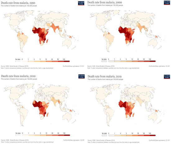 - Roser, M.; Ritchie, H. Malaria. Available online: https://ourworldindata.org/malaria (accessed on 14 October 2022).