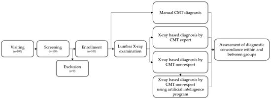 Artificial intelligence (AI) has been used recently to identify spinal alignment []. For instance, in one study, AI was used to diagnose adult spinal deformity (ASD) and predict the consequences of ASD correction surgery []. Additionally, some studies have identified spinal curvature with AI using machine learning techniques [,]. Several studies have also focused on using AI for spine diagnosis. For example, in some studies, AI automatically recognized spinal markings through deep learning and analyzed alignment to aid diagnosis [,]. However, these studies have been limited to the field of conventional medicine for the identification of problems in specific areas, such as bone density [] and spinal disc []; determining the need for surgery by predicting the degree of disease progression and postoperative results []; measurement of angle in scoliosis []; and analysis of stability in spondylolisthesis []. Furthermore, an X-ray image-based AI program that can be used in CMT diagnosis has been developed []. However, limited studies have investigated its diagnostic benefits through application in actual clinical practice. Moreover, studies analyzing intra- and inter-rater reliability and clinical diagnostic concordance of manual diagnosis (MD), X-ray image-based diagnosis (XRD), and diagnosis using an AI program are lacking.