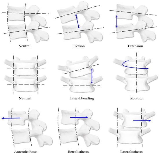 CMT spinal diagnosis is based on three-dimensional movements. The standard kinesiologic system based on vertebral body malposition and limitations of joint range of motion is followed during diagnosis. Furthermore, the listing system of spinal malposition follows the Medicare method [,]. This study diagnosed malposition and listhesis of the upper vertebral body relative to the lower vertebral body for five lumbar spine levels. Figure 2 shows the detailed diagnosis system.