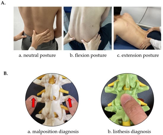 The following supporting information can be downloaded at: https://www.mdpi.com/article/10.3390/diagnostics12112732/s1. Figure S1, A detailed description of the malposition diagnosis through the manual method with the transverse process palpated on the left; Table S1, Number of diagnoses by detailed item in listhesis diagnosis; Table S2, Number of diagnoses by detailed item in malposition diagnosis.