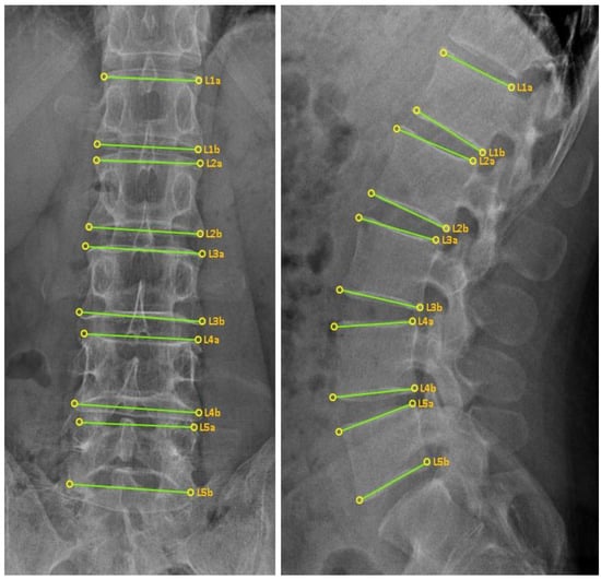 The CMT-AI program was a lumbar landmark detection program using a convolutional neural network developed for this study. The program automatically detects four outer vertices and the upper and lower surfaces of the vertebral body in a two-dimensional projected rectangular lumbar vertebral body image, which displays them as points and line segments. The program’s performance was good, with a detection success rate of 99.7% and a detection error of 4.54 ± 3.00 pixels []. Three CMT non-experts were provided with X-ray image data (Figure 4) containing information on the four vertices of the outer vertebral body. Then, the same cases were re-diagnosed using the CMT-AI program by the three non-experts. The results were recorded in the case report forms. An interval of 1 month from the end date of the first diagnosis was ensured to minimize the chance of investigators remembering the diagnosis performed based on image data only (without the aid of the AI program).