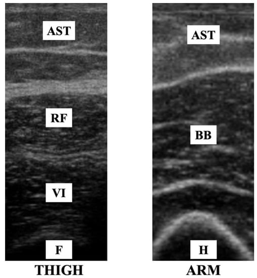 Muscles and adjacent structures on ultrasound images depending on the transductor placement. AST, adiposity subcutaneous fat; RF, rectus femoris; VI, vastus intermedius; BB, biceps braquii; F, femur; H, humerus.