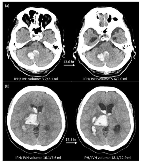 - Yogendrakumar, V.; Ramsay, T.; Fergusson, D.A.; Demchuk, A.M.; Aviv, R.I.; Rodriguez-Luna, D.; Molina, C.A.; Silva, Y.; Dzialowski, I.; Kobayashi, A.; et al. Redefining Hematoma Expansion With the Inclusion of Intraventricular Hemorrhage Growth. Stroke 2020, 51, 1120–1127. [Google Scholar] [CrossRef]