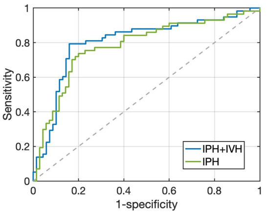 We implemented a deep learning algorithm using the U-net architecture [45] to perform automatic segmentation of both IPH and IVH. The preliminary model was applied to test the cases included in the present study and achieved the dice similarity coefficient of 0.838. The examples of the IPH and IVH segmentation with concordant and discordant results are illustrated in the Supplementary Materials files (Figures S3 and S4). Because IVH is present in one-third of sICH patients, a larger dataset of sICH is necessary for the development of a reliable automatic tool for IPH and IVH segmentation. Considering the high frequency of IVH in the sICH patients, the better performance of RMP+V in HE prediction, and the high fidelity of total ICH segmentation using a deep learning approach, integration of such an automated segmentation algorithm into the HE prediction model would be a reasonable clinical approach.
