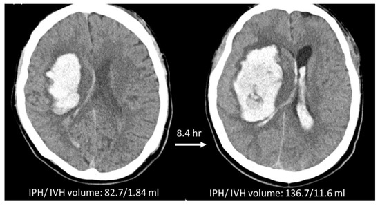 Spontaneous intracerebral hemorrhage (sICH) accounts for about 7–15% of all strokes and carries a mortality rate of about 40%, with half of fatalities occurring within the first two days after an ictus [1,2,3]. The hallmark of sICH is the intraparenchymal hemorrhage (IPH). The high rate of early neurological deterioration after sICH is related in part to active bleeding that may proceed for hours after the symptom onset [4]. Among patients undergoing head CT scans within 3 h of sICH onset, 28% to 38% have hematoma expansion (HE) on follow-up CT scans, with volume greater than one third compared with the hematoma volume on original CT scans [3,4]. HE has also been shown to be an independent predictor of clinical deterioration and poor outcomes [3,5,6,7].