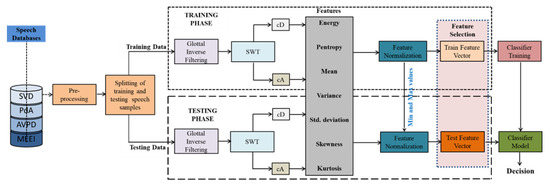 A key component of human conversation is speech signals. However, the multiple laryngeal illnesses harm the parts of the voice box that are responsible for speech, creating an abnormal voice that is unfit for everyday uses [1]. As a result, it is essential to identify the source of a voice anomaly as soon as possible. Traditional methods for examining voice dysfunction in medical practice are subjective and invasive. The grade, roughness, breathiness, asthenia, and strain (GRBAS) and the Consensus Auditory Perceptual Evaluation–Voice (CAPE-V) scales are used in the traditional perceptual analysis [2]. Such perceptual examination is subjective, imprecise, and necessitates expert professionals. Laryngoscopy, stroboscopy, and endoscopy are methods used in the obstructive clinical process to observe the larynx’s inner structure [3]. These testing methods necessitate a skilled ear, nose, and throat doctor and a cutting-edge laboratory outfitted with instruments. The patient may perform (present) a reflex response in the orinasal cavity while using these methods, resulting in erroneous assessments [4]. For the early and reliable assessment of laryngeal illnesses, an effective alternative approach focused on an acoustical analysis of the clinical voice may be possible. There are two main types of established voice pathology identification frameworks: classical pipeline frameworks and newer end-to-end frameworks [5]. The conventional pipeline scheme is made up of two parts: extraction of features and identification [5,6]. The feature extraction section attempts to obtain useful information from speech records. The attribute sets employed by the research community for the identification of voice abnormalities can be divided into four types: (1) perturbation attributes; (2) spectral and cepstral attributes; (3) complexity attributes; and (4) glottal attributes [5,6,7]. A classification algorithm is used in the detection phase to categorize the source speech as normal or pathological. The numerous acoustic analysis-based approaches focused on machine learning are addressed in [8]. In the end-to-end voice analysis approach, huge speech records are required. However, because of a scarcity of records, end-to-end schemes have still not been extensively used in the research area of voice pathology identification [6,7]. The analysis of pathological voice is challenged by the scarcity of available speech samples, as these samples come from patients whose illness may be so severe that only short recordings are possible. As a result of the scarcity of the large quantity of training samples required to educate end-to-end schemes, the conventional pipeline scheme remains a workable option [7].