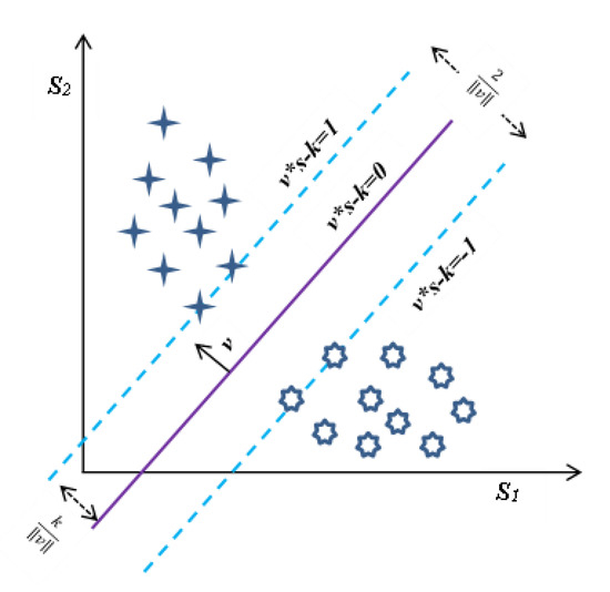 where is the vector perpendicular (normal vector) to the hyperplane and need not be a unit vector. The factor is used to calculate the offset of a hyperplane from the origin along the normal vector . If the input data used to train the SVM are linearly distinguishable, we can select two parallel hyperplanes that split two data classes. Moreover, one has to ensure that the separation of them is as high as possible. The area constrained by two hyperplanes such as these is termed the “margin”, and the max-margin hyperplane is the hyperplane that exists midway between them. These hyperplanes can be characterized by equations with standardized input data [39].