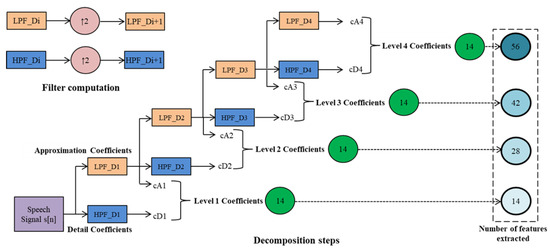 In the study of transient phenomena, wavelet transform is widely used to obtain temporal and frequency information from the signal [44,45]. A four-level decomposition of the signal employing the SWT is shown in Figure 5. SWT generates two sets of coefficients for a signal s[x] of length L in the first stage: approximation coefficients A1 and detail coefficients D1. Convoluting s with the low-pass filter (LF_D) for the approximation component and the high-pass filter (HF_D) for the detail component yields these coefficients. Using a similar strategy, the approximation coefficients A1 are separated into two pieces in the next level. However, in this stage, up-sampling is performed, and s[x] is substituted by A1, resulting in A2 and D2. In this research, the glottal wave is decomposed up to level four. The Haar wavelet is used, as the energy and statistical metrics mined from the sub-bands have better discrimination ability compared to higher-order Daubechies wavelets.