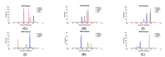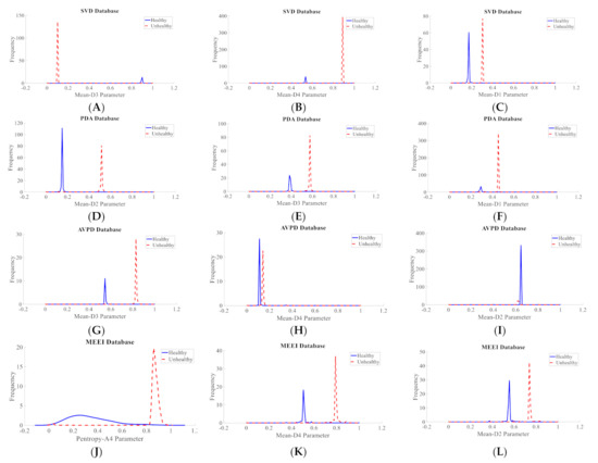 Density plots for the top three descriptors used in the diagnosis of voice illnesses: (A) Density plot for Mean-D3 parameter of SVD, (B) Density plot for Mean-D4 parameter of SVD, (C) Density plot for Mean-D1 parameter of SVD, (D) Density plot for Mean-D2 parameter of PdA, (E) Density plot for Mean-D3 parameter of PdA, (F) Density plot for Mean-D1 parameter of PdA, (G) Density plot for Mean-D3 parameter of AVPD, (H) Density plot for Mean-D4 parameter of AVPD, (I) Density plot for Mean-D2 parameter of AVPD, (J) Density plot for Pentropy-A4 parameter of MEEI, (K) Density plot for Mean-D4 parameter of MEEI, (L) Density plot for Mean-D2 parameter of MEEI.