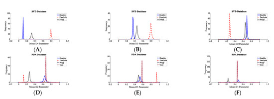 The classification rate with all 56 features and the top five features is nearly identical across all datasets. As a result, it is shown that less than 9% of the entire number of descriptors is sufficient to achieve an almost equal recognition rate. The suggested system’s computational complexity decreases because of the fewer descriptors and smaller feature vectors. The highest accuracy obtained with the AVPD database using the top five descriptors was 99.87%. In the case of the SVD, AVPD, and MEEI databases, the top three descriptors performed extraordinarily. The classification accuracy attained with these top three features is nearly identical to that achieved only with the top five and all 56 features. Figure 3 shows the PDF plots of the top three descriptors, which are not overlapping and endorse the high discrimination capacity.
