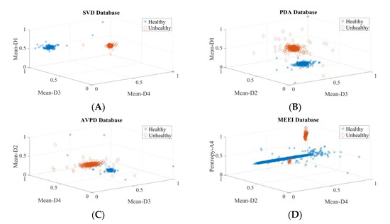 Scatter plots of three most common descriptors for pathology identification process: (A) Scatter plot of top three descriptors of SVD, (B) Scatter plot of top three descriptors of PDA, (C) Scatter plot of top three descriptors of AVPD, (D) Scatter plot of top three descriptors of MEEI.