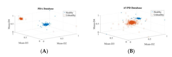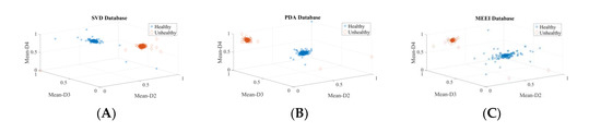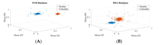 Two experiments are carried out to validate the efficacy of extracted wavelet-based features for voice disfunction recognition, one for each of the top three ranked descriptors and one for all 56 descriptors. Table 4 displays the calculated performance-assessing indicators of the classifiers. The observation that the detection rates for the top three and all 56 features are nearly equal leads to the conclusion that only the top three descriptors are vital to detect voice pathology. The suggested system’s computational complexity decreases because of the fewer descriptors and smaller feature vectors. In addition, these results reveal that the features are not noisy, as increasing the number of descriptors has no negative influence on the detection accuracy. The values of classifier performance metrics look identical in many tables because of the very small number of false positives (FP) and false negatives (FN). The scatter plot for these top three descriptors is shown in Figure 8 and clearly shows the power of discrimination as the clusters of healthy and pathological data points (samples) do not overlap. The outliers are not removed; hence, some data points become mixed into other class data points.