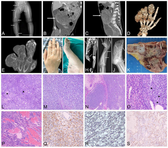 Maffucci syndrome (cases 4–6) included two females and one male (Table 1). In case four, the patient presented with a swelling of the right finger and a left ulnar lesion at the age of three. The left ulnar nodule was proven to be enchondroma histologically by excision at the age of six. In the following 14 years, multiple intraosseous eccentric masses were presented gradually on his right fingers, accompanied by multiple subcutaneous soft tissue masses. Case five began to have nodules in her hands and feet when she was only two–three-years-old. In the following 33 years, extensive purple-blue skin masses appeared subsequently in the hands, feet, limbs, shoulders and back (Figure 1F,G). The patient showed rapid progression of swelling and pain in her right knee for about half a year before her consultation. The PET-CT scan showed multiple expansive bone destructions with irregular calcification and an accompanying soft tissue mass surrounding the right proximal tibia lesion (Figure 1H). In case six, a deformity of the left radius and ulna was identified at the age of six. An X-ray analysis showed a curved deformity of the left radius and ulna, and eccentric low-density shadow of multiple short tubular bones of the left hand and foot and the left distal tibia (Figure 1I,J). MRI showed multiple high-density nodules in the left plantar and medial subcutaneous.