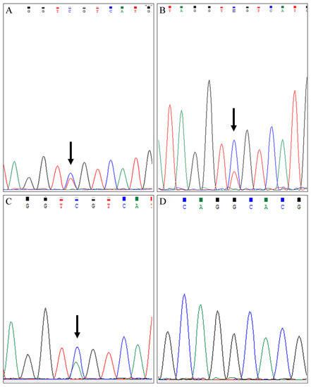 (A) IDH1 mutation in ovarian tumour: p.R132C (c.394C > T) (indicated by arrow). (B,C) IDH1 mutations in cartilage tumours: p.R132C (c.394C > T) (indicated by arrow) and p.R132H (c.395G > A) (indicated by arrow). (D) IDH2 mutation: wild type.