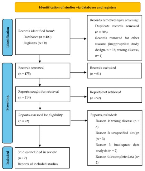 Our search yielded 400 unique records, out of which only 7 were included in the meta-analysis after abstract and full text screening (Figure 1). We did not retrieve additional items after screening references and related articles.